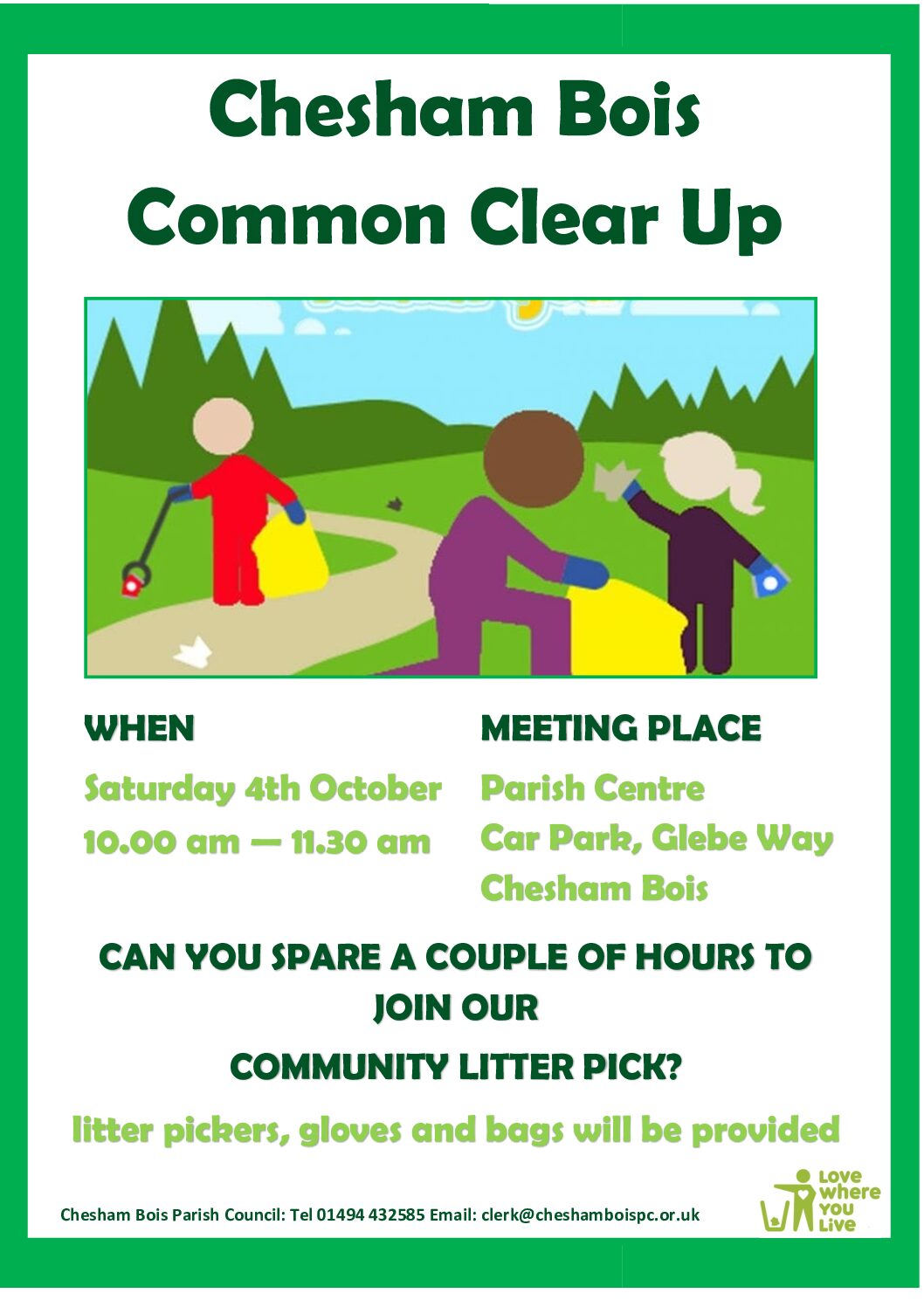 The Chesham Bois Autumn Common Clear-up will take place on Saturday 4th October. We will be leaving the Parish Centre at 10 am for a community litter pick ending at 11.30 am. Can you spare a couple of hours to join us? Litter pickers, gloves and bags will be provided. We look forward to seeing […] [Read full article…]